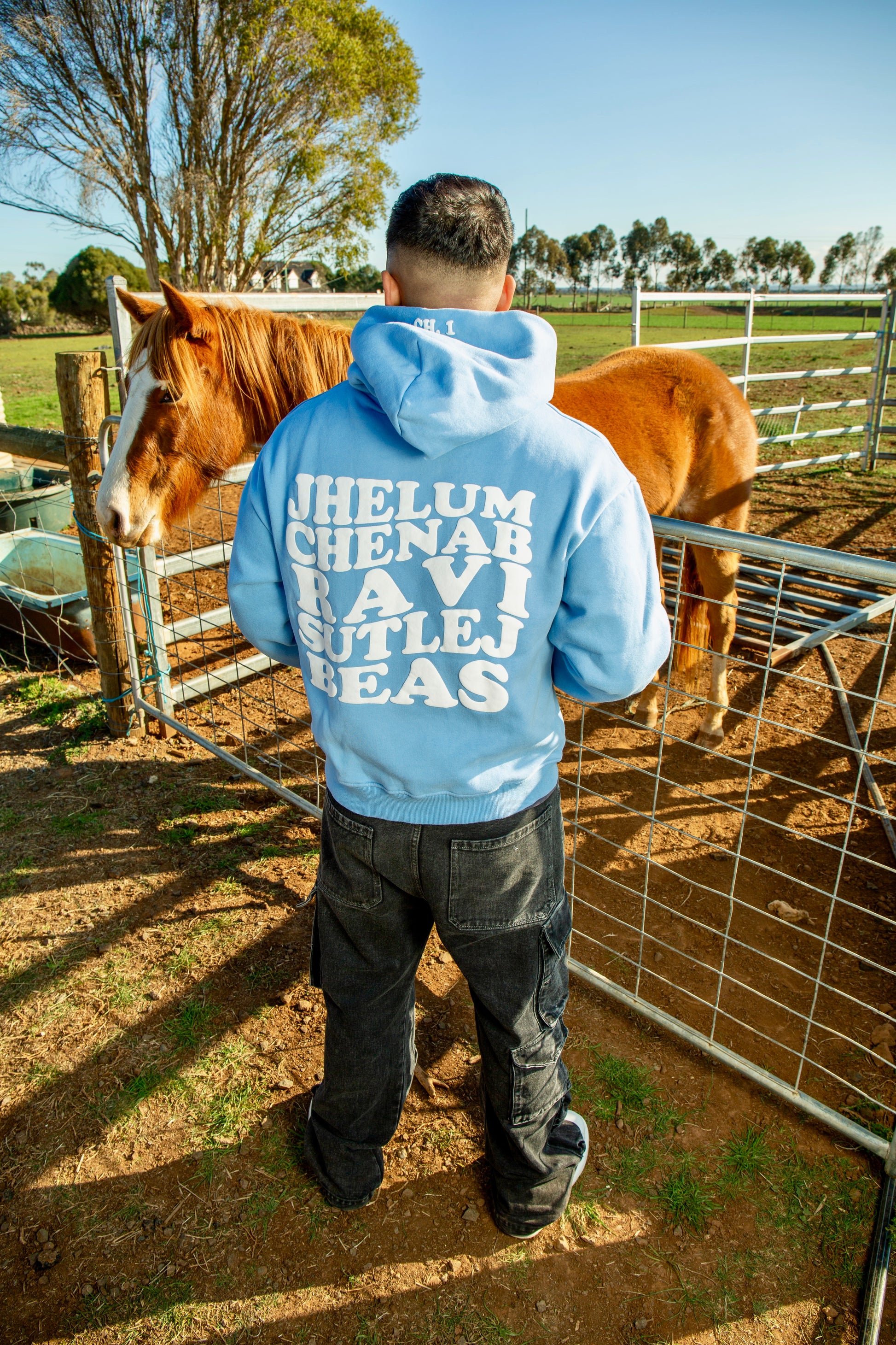 Upgrade your wardrobe with our Panjab Hoodie made with 100% cotton in a light blue color way with white puffed text. Produced from the most comfortable and breathable cotton. The Panjab hoodie is made with high-quality fabric assures that your hoodie will last years to come, even with frequent wash and wear. Our Panjab hoodie is the perfect addition to any casual outfit as you can wear it while walking around your the city or simply chilling a home. Representing the five river of Panjab gives a sense of belonging of being a part of the Panjabi community.